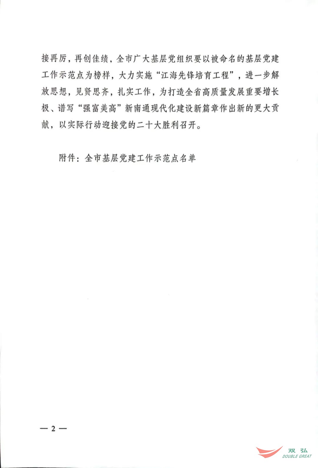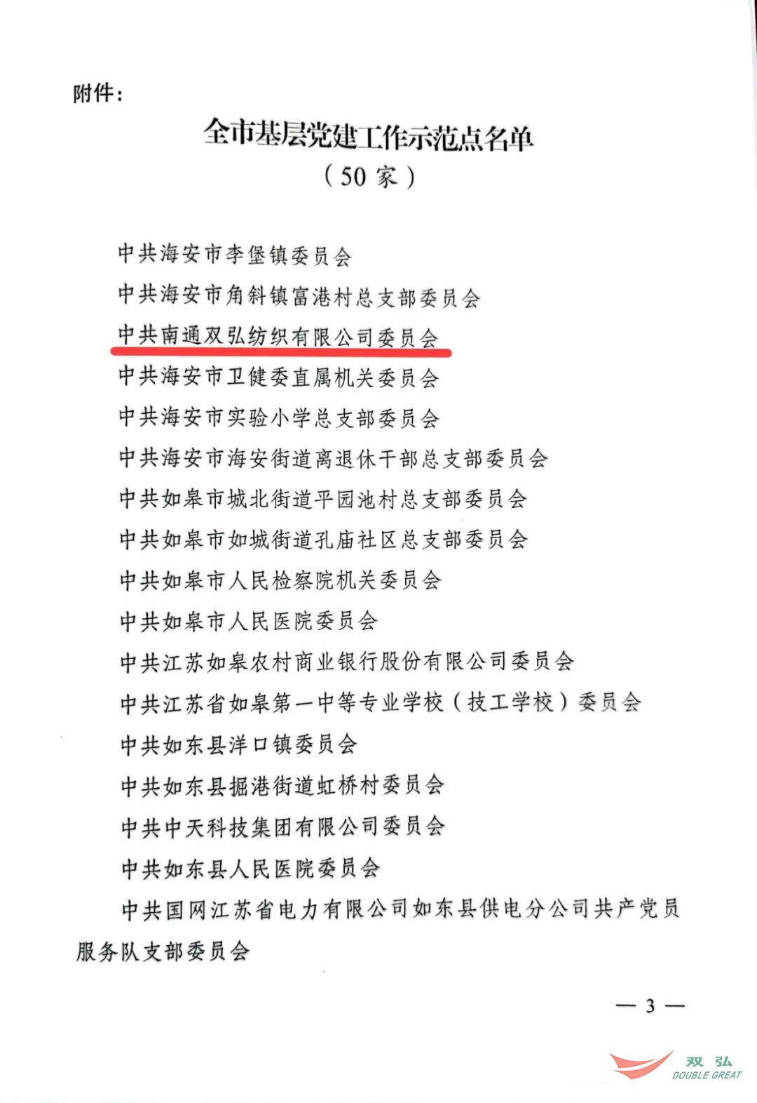 เมื่อเร็ว ๆ นี้คณะกรรมการของคณะกรรมการเทศบาล CPC Nantong ได้ออกเอกสารการตั้งชื่อองค์กรปาร์ตี้ระดับรากหญ้า 50 แห่งเป็นเว็บไซต์สาธิตการสร้างอาคารระดับรากหญ้าของเมือง คณะกรรมการพรรคของ Nantong Double Great Textile Co. - Ltd. ได้รับรางวัลชื่อ "เว็บไซต์สาธิตการสร้างอาคารระดับรากหญ้าของเมือง"
