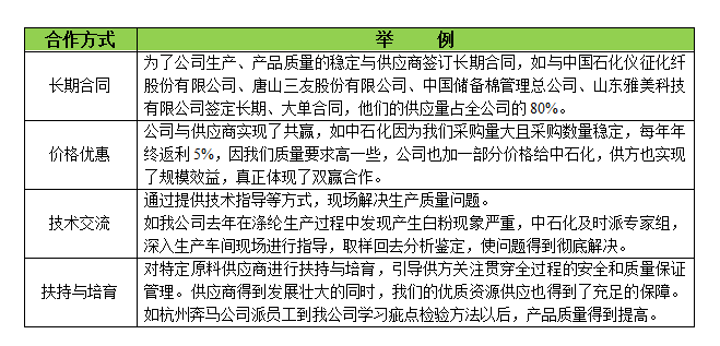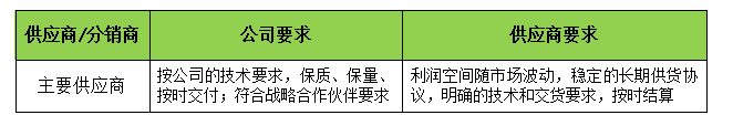 บริษัท ให้ความสนใจเป็นพิเศษกับความสัมพันธ์กับซัพพลายเออร์และได้ระบุซัพพลายเออร์และพันธมิตรที่สำคัญ เพื่อส่งเสริมความร่วมมือระยะยาวการปรับปรุงซึ่งกันและกันและการพัฒนา win-win ระหว่างทั้งสองฝ่ายส่วนใหญ่จะดำเนินการด้านต่อไปนี้