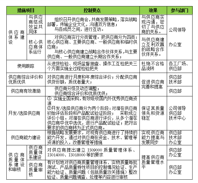ใช้การประเมินผลและมาตรการจูงใจสำหรับซัพพลายเออร์เพื่อส่งเสริมการพัฒนาตนเองและการปรับปรุงซัพพลายเออร์อย่างต่อเนื่อง แนะนำทรัพยากรผู้จัดหาคุณภาพสูงผ่านการพัฒนาและการก่อสร้างของซัพพลายเออร์ปรับปรุงระดับการผลิตและระดับการจัดการของซัพพลายเออร์ที่มีอยู่ลดต้นทุนการจัดซื้อและปรับปรุงความสามารถในการแข่งขันของห่วงโซ่อุปทาน